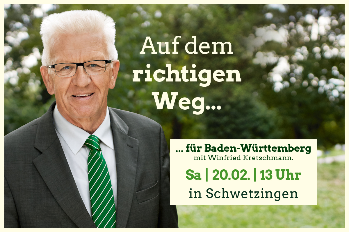 Unser Ministerpräsident Winfried Kretschmann wird in der kommenden Woche unseren Wahlkreis besuchen und nach Schwetzingen kommen! Alle interessierten Bürgerinnen und Bürger sind herzlich zum öffentlichen Empfang mit musikalischer Umrahmung und der Möglichkeit zum Gespräch mit dem grünen Landtagsabgeordneten Manfred Kern eingeladen: